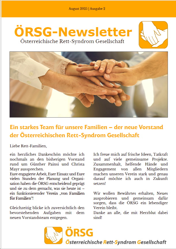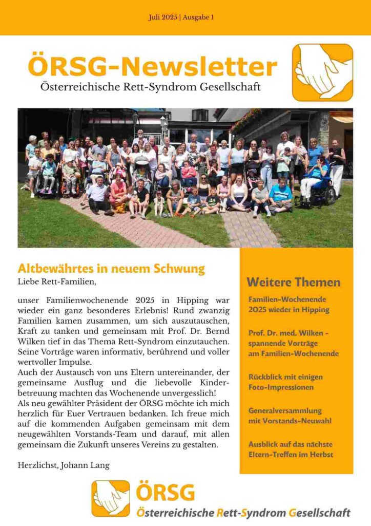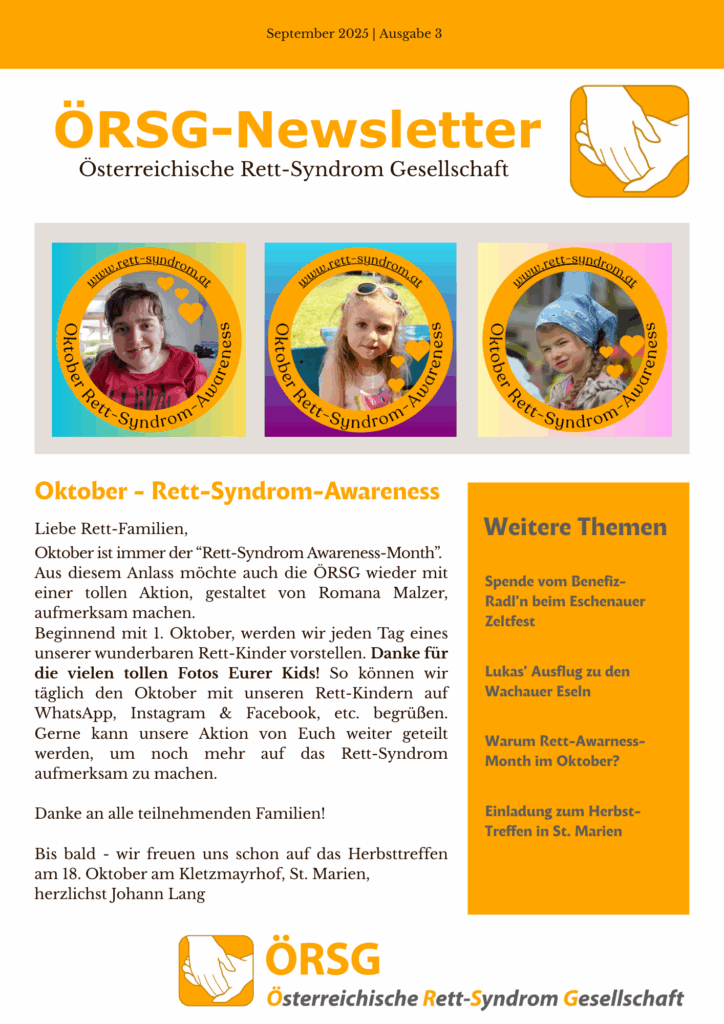 In dieser Ausgabe berichten wir über die großartige Spende vom Benefiz-Radl’n beim Eschenauer Zeltfest, Lukas’ besonderen Ausflug zu den Wachauer Eseln und laden herzlich zum Herbsttreffen in St. Marien ein. Außerdem werfen wir einen Blick auf den „Rett-Syndrom Awareness Month“ im Oktober und die geplanten Aktionen der ÖRSG.